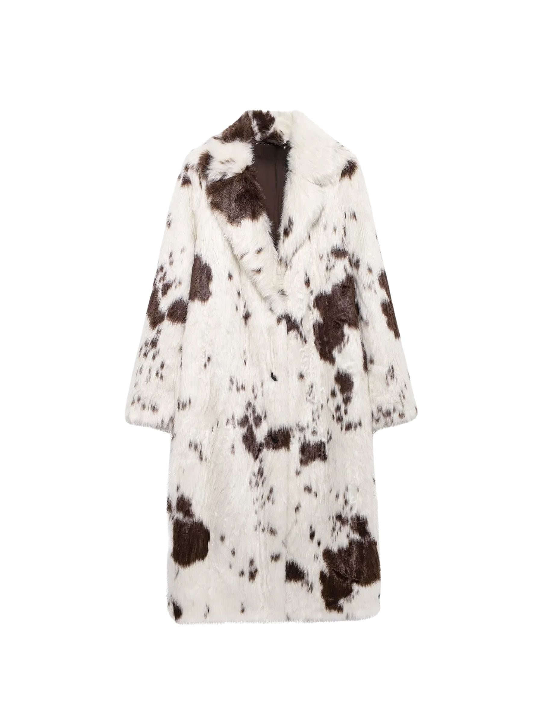 Dallas Faux Fur Cow Print Coat – Cozy Longline Jacket for Bold Fashion Statements
