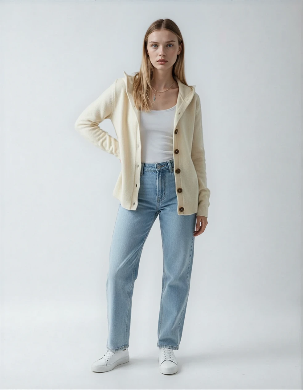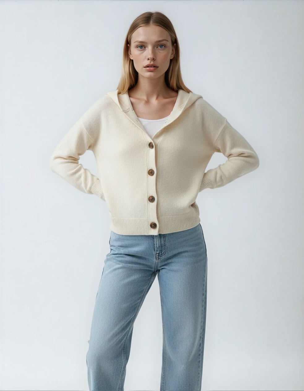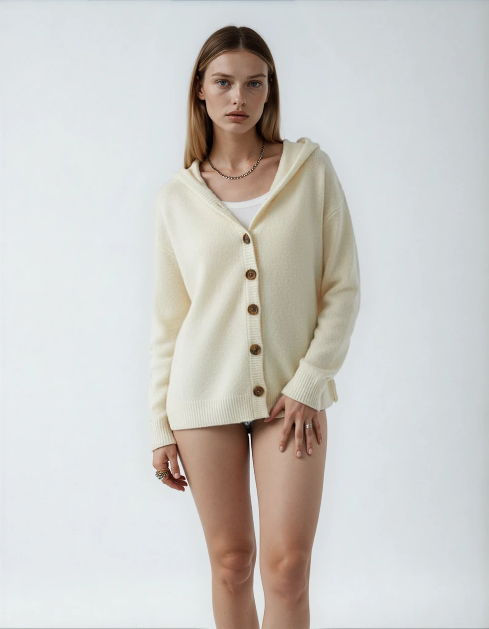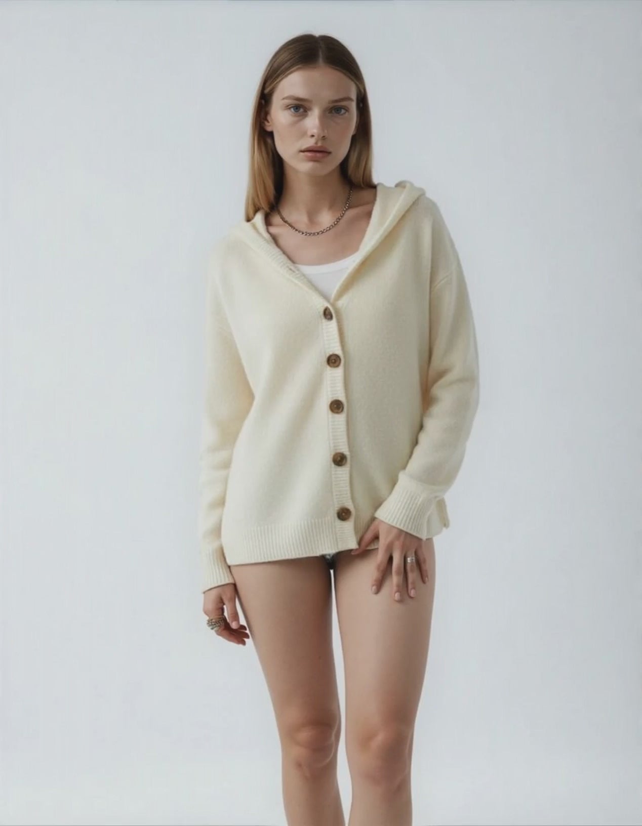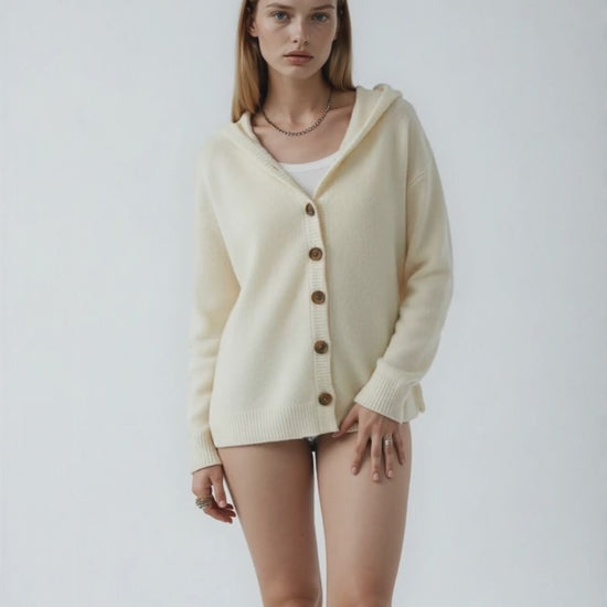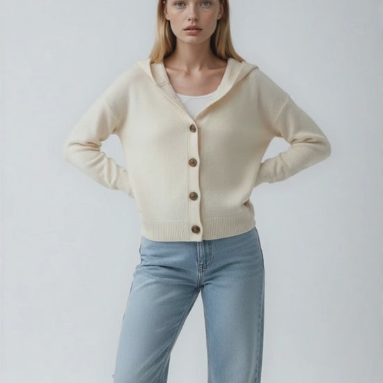 Den stickade koftan med huva Felicia imponerar med sin lätta komfort och värmer utan att kännas tung. Den lediga passformen gör att du enkelt kan bära den över en t-shirt eller blus, medan huvan ger en mysig kokongeffekt – perfekt för svalare stunder.