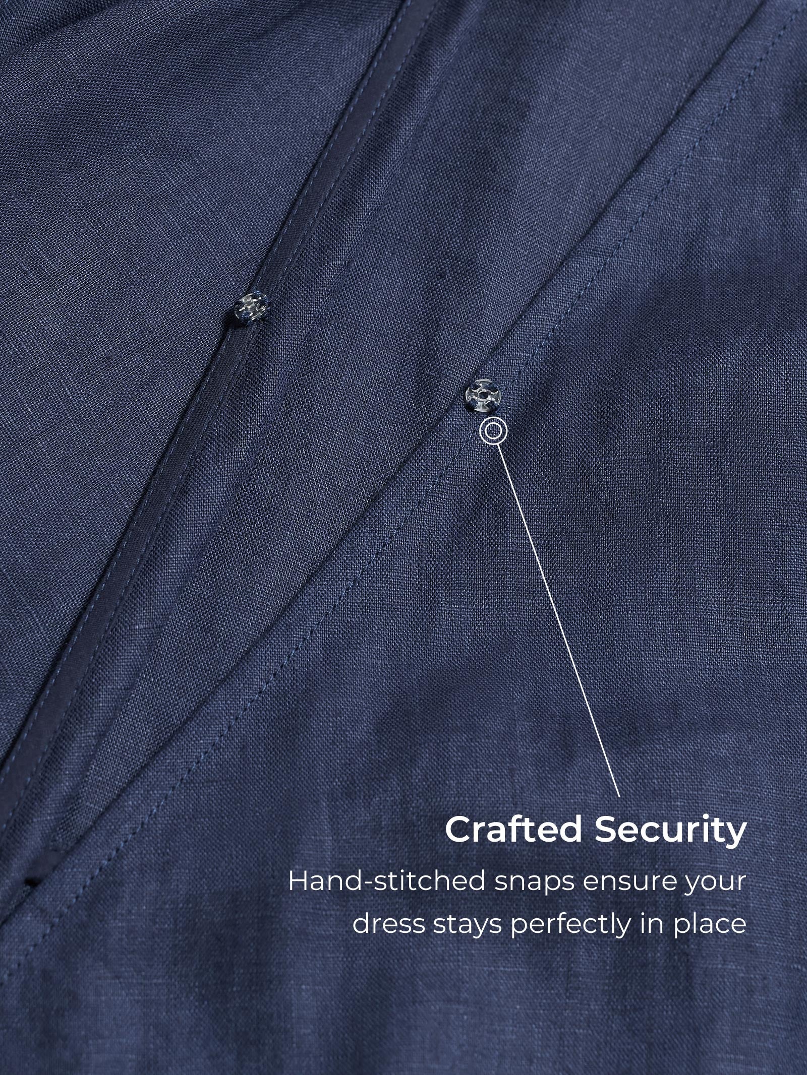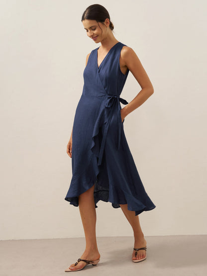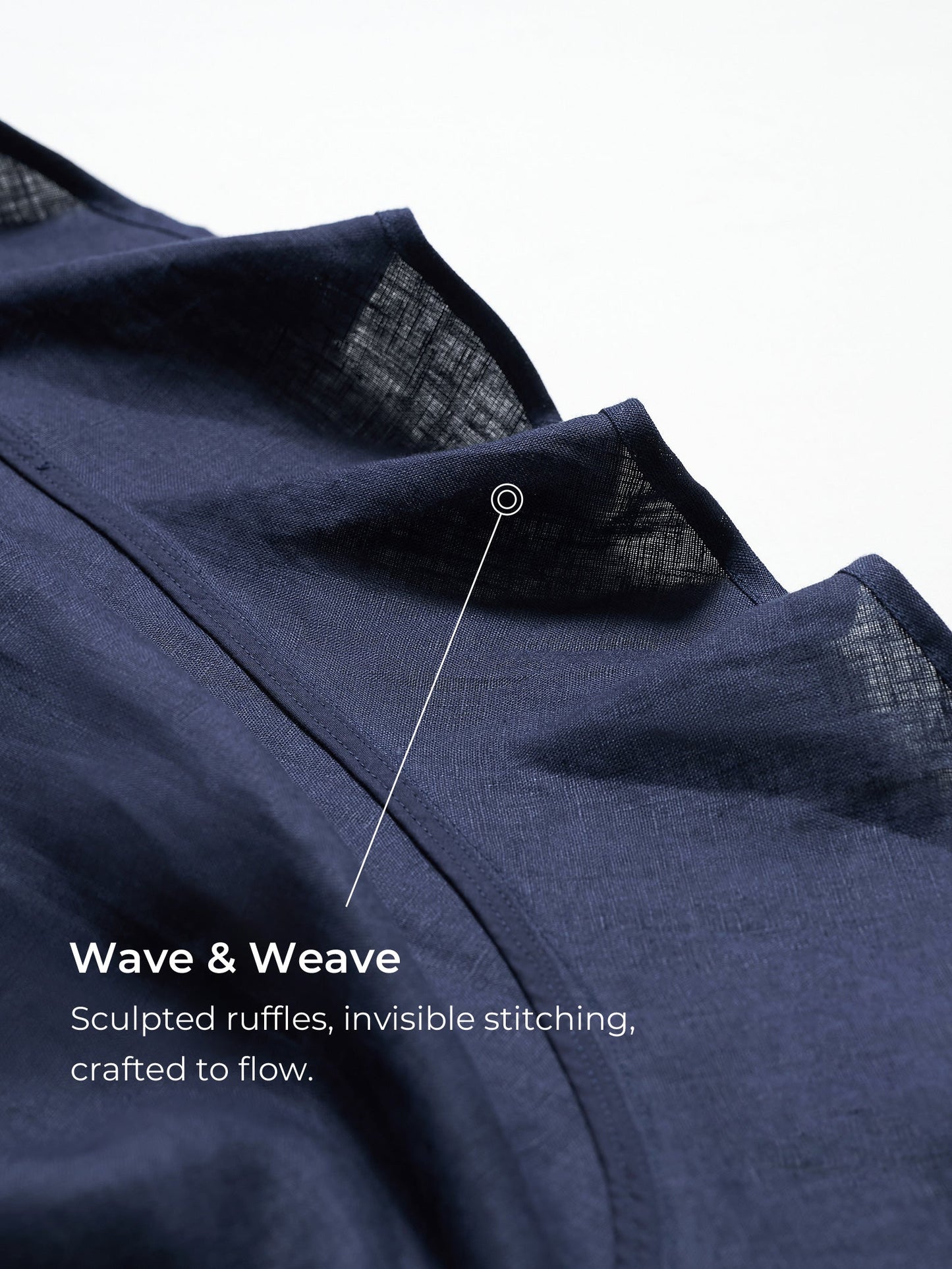 Linen V-Neck Maxi Dress for Women with Asymmetric Ruffle Hem and Hidden Pockets – Elegant Long Dress in Navy Blue